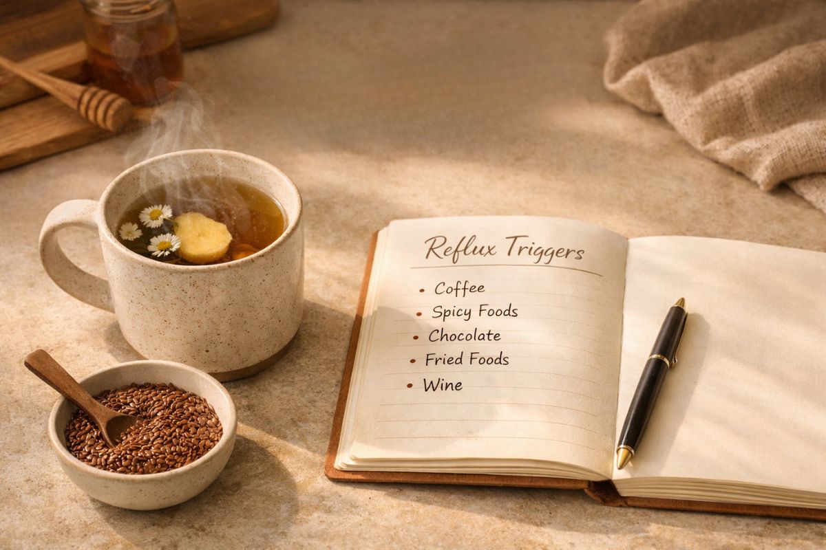 A flat-lay photograph showing a 50-something woman's kitchen counter with a cup of ginger-chamomile tea steaming gently, a small bowl of flaxseeds, and a journal open to a page titled 'Reflux Triggers.'